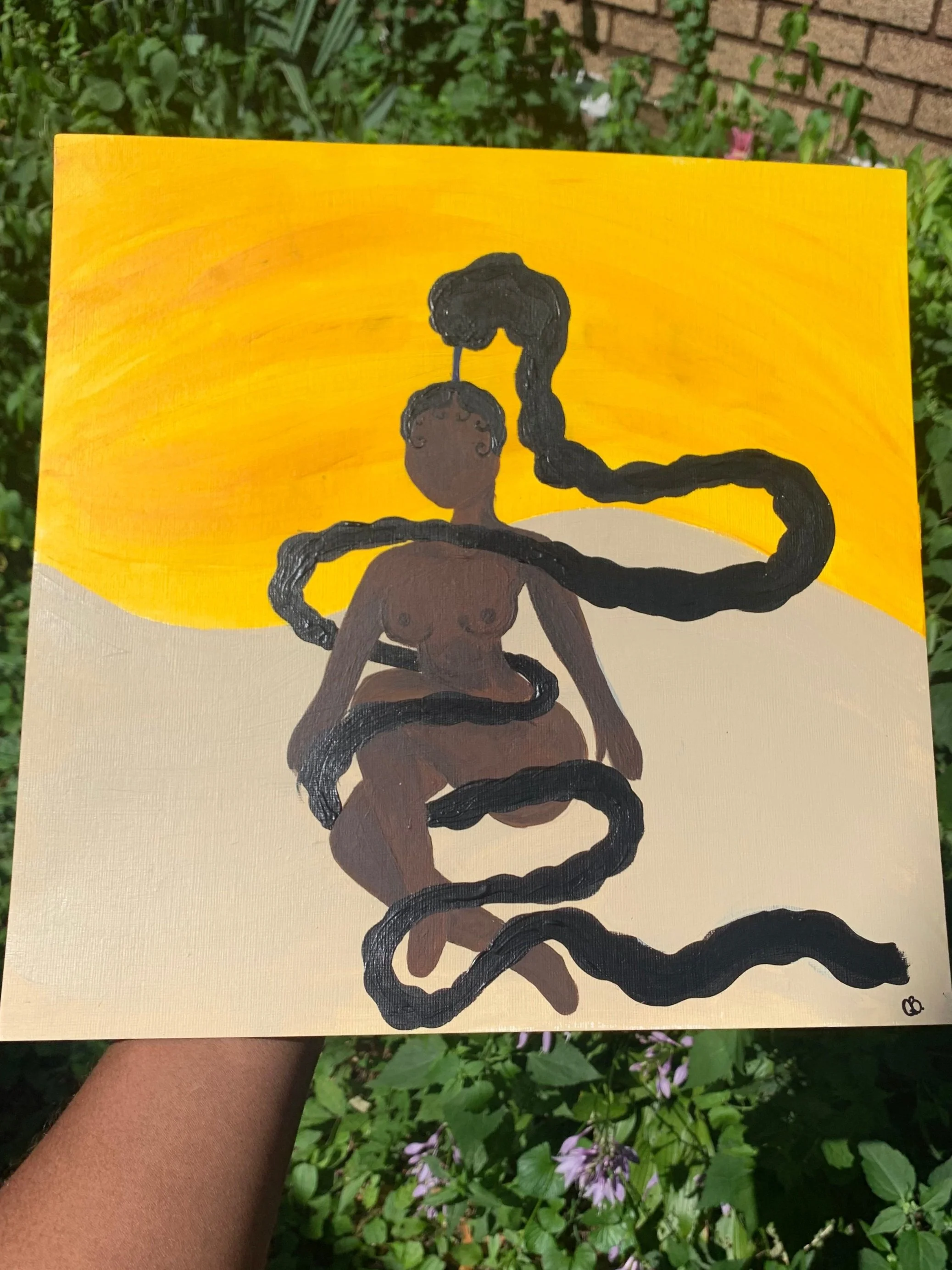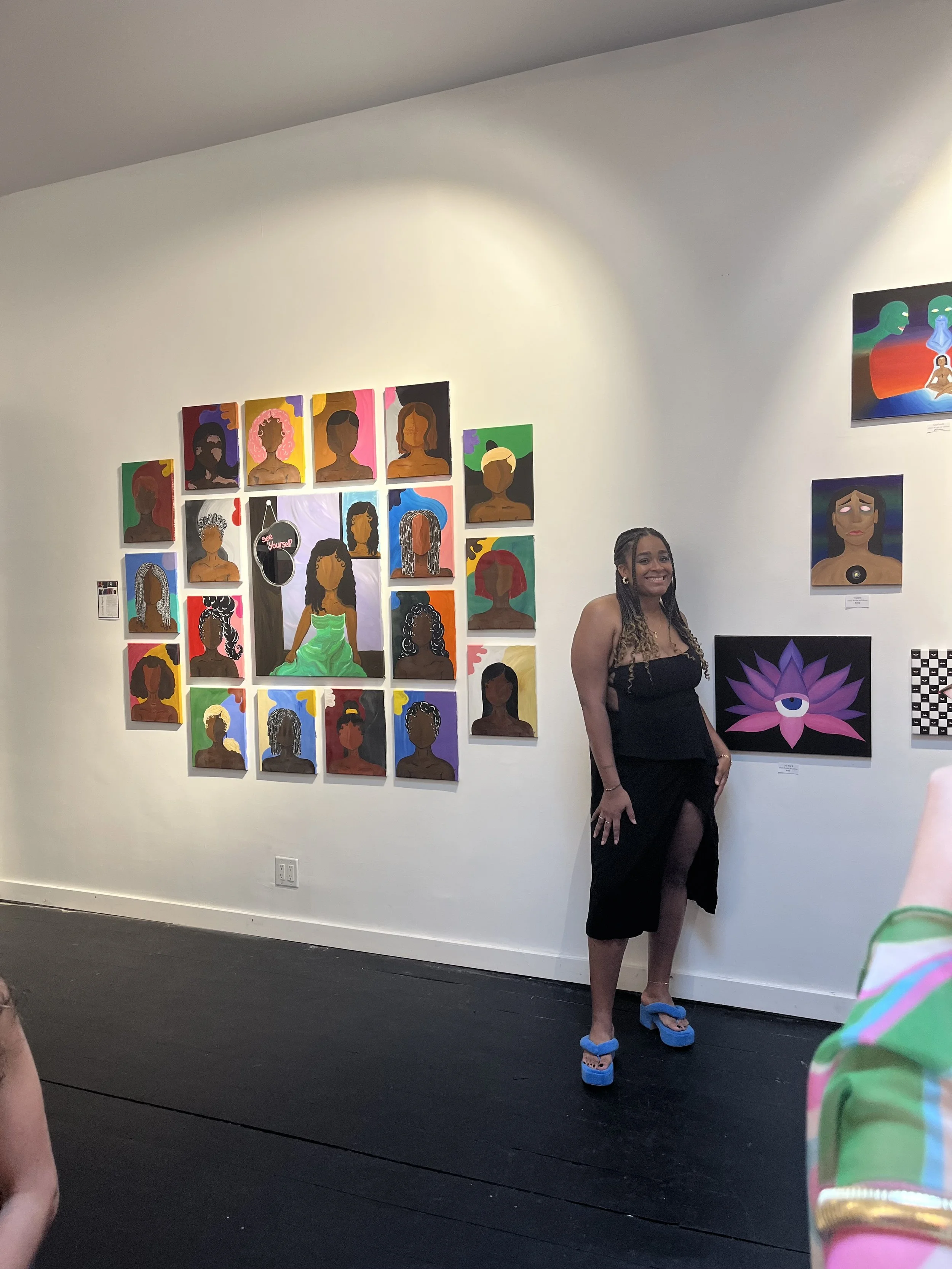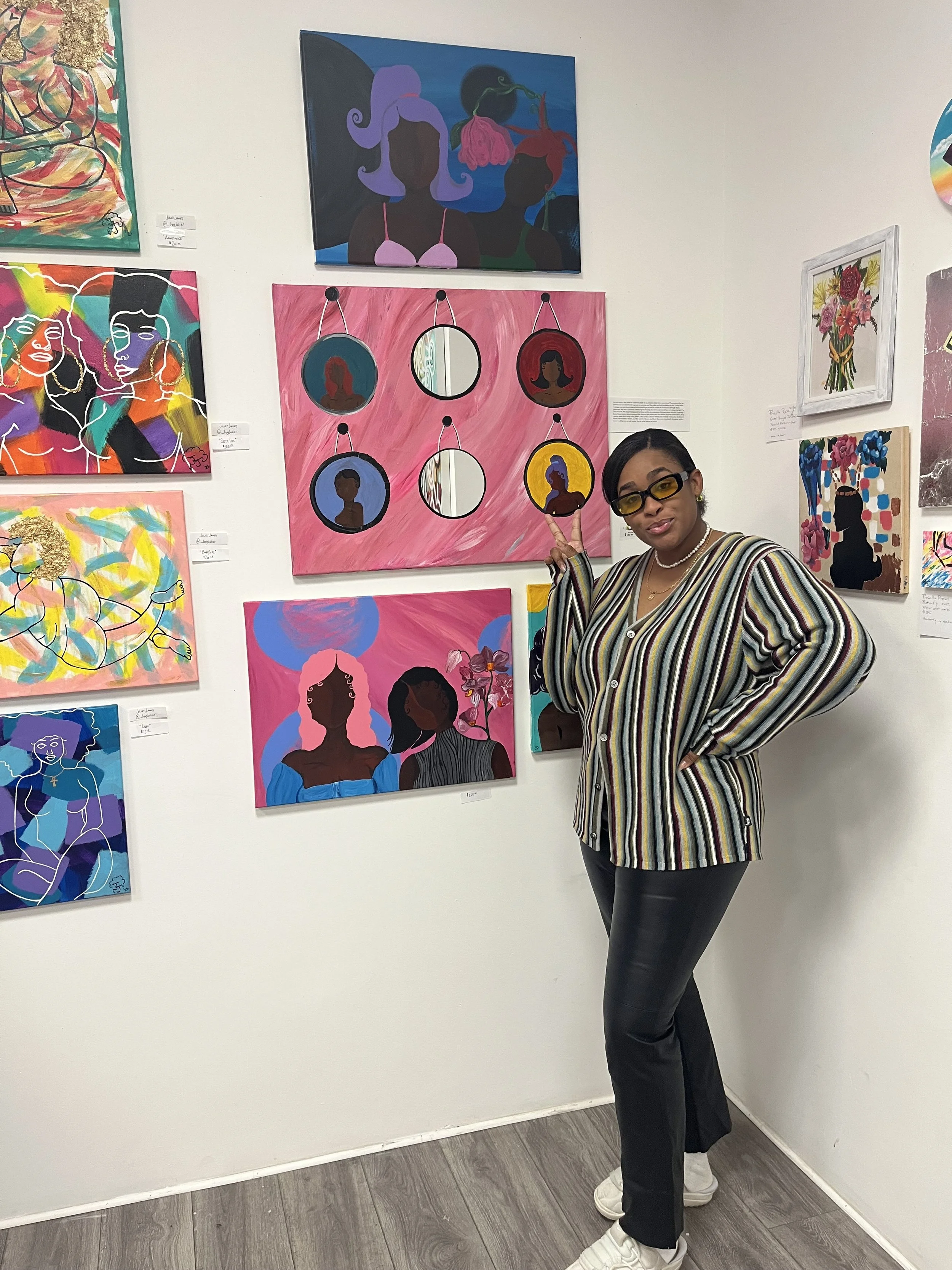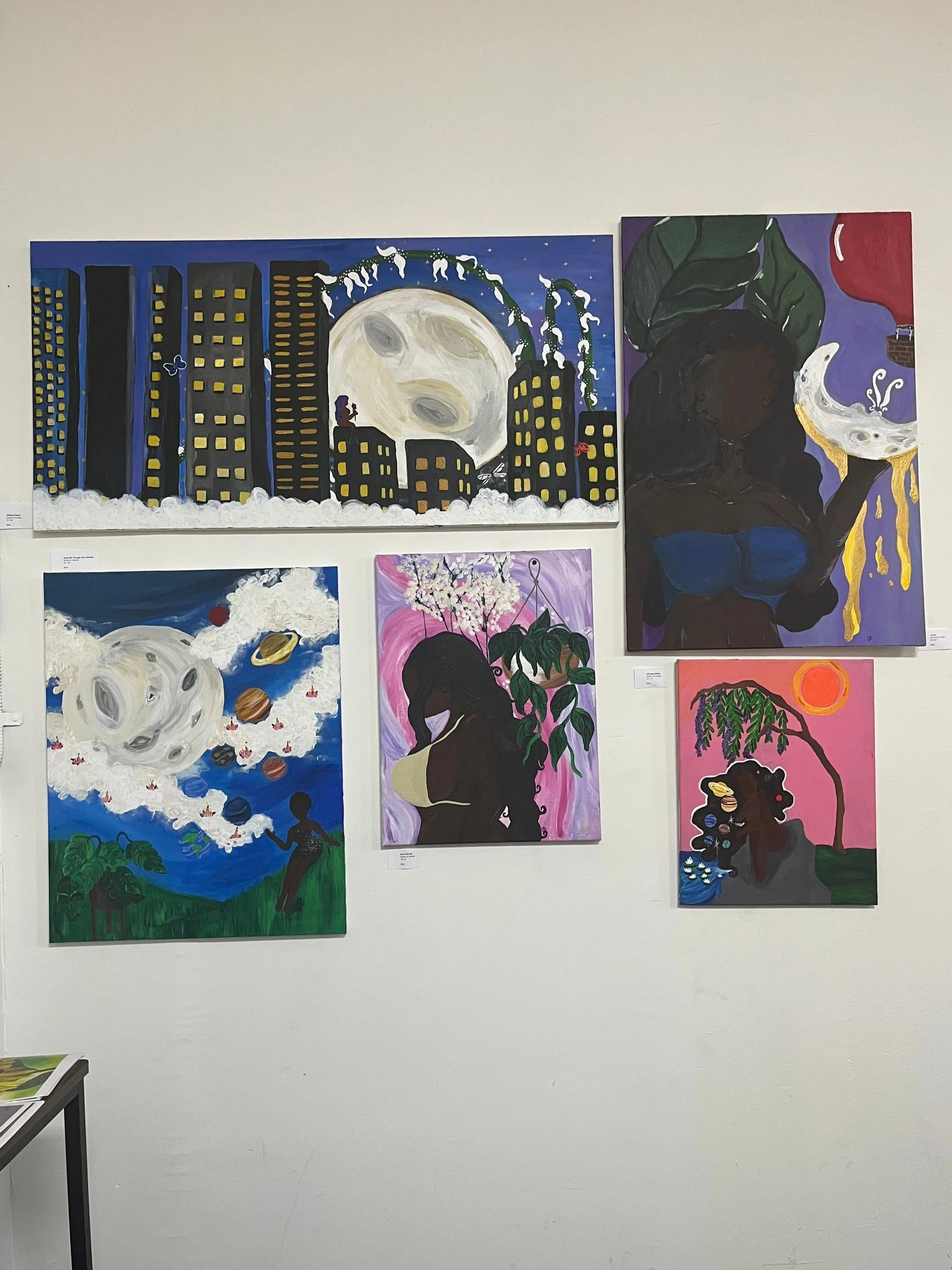 Quanaisha works with paint on canvas to express the diversity amongst women she has seen throughout her life, such as her mother, close friends, etc. In addition, Quanaisha’s love for painting emerged after seeing the work of two powerful women in art and inspiration to her: Georgia O’ Keefe and Frida Kahlo. By discovering and sharing her interpretations of these inspirations and others, she finds her magical yet realistic style.